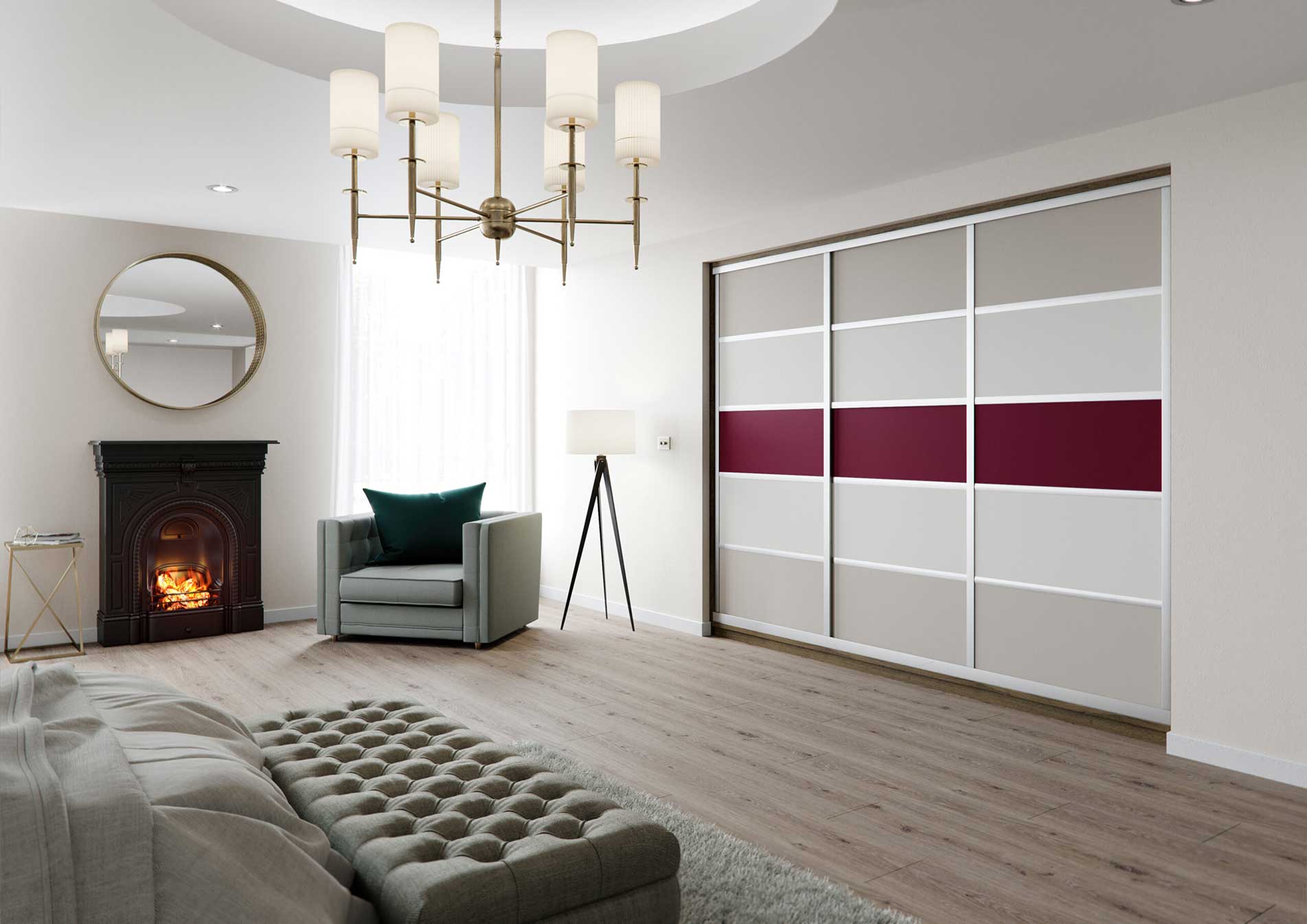 Discover the Features of our 5 Panel, 3 Door Stone Cashmere Aubergine Glass Wardrobe