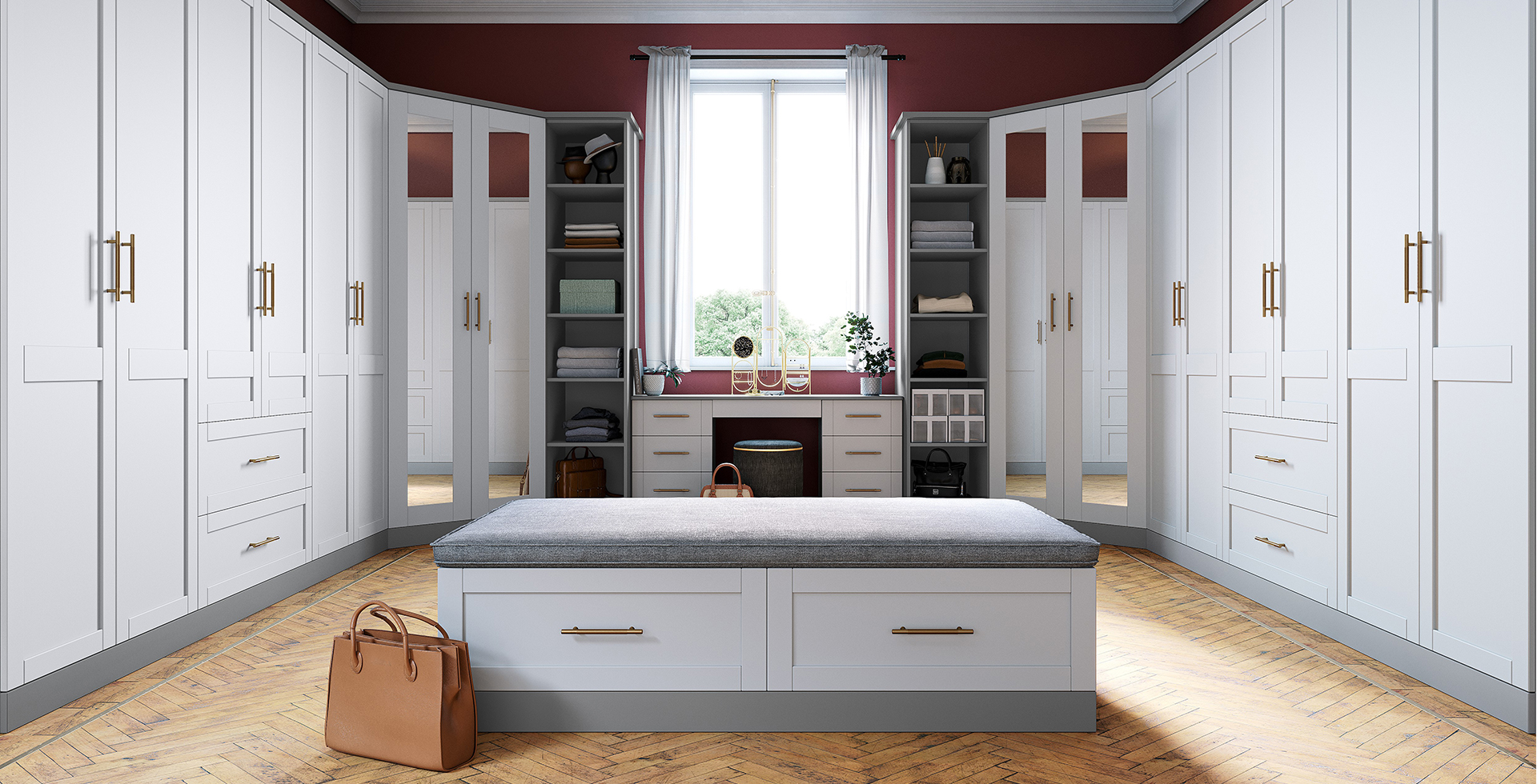 Experience Luxury and Organisation with Our Light Grey & Dust Grey Tampa Design Fitted Walk In Wardrobe Dressing Room